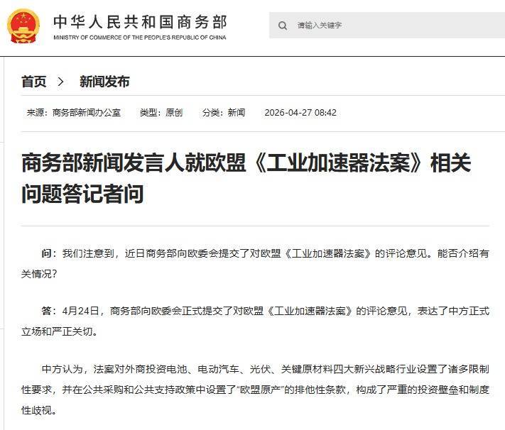答:4月24日,商务部向欧委会正式提交了对欧盟《工业加速器法案》的评论意见,表达了中方正式立场和严正关切。