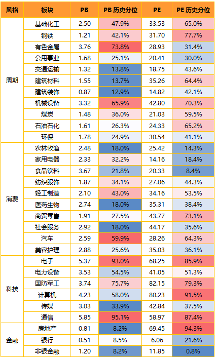 注:1)单元格越红,代表同期数值排名越高,反之越低;2)历史分位取自2005年以来的历史数据,表现当下估值所处历史的位置,数值越高,所处历史估值越高。