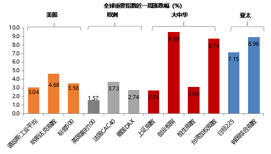 海外:本周全球重要指数普涨。美伊停火推动全球风险偏好回暖。美股方面,科技与消费板块领涨,纳指、标普和道指周内涨跌幅分别为4.7%、3.6%和3.0%。欧洲股方面,法国CAC40、德国DAX和英国富时100周内涨跌幅分别为3.7%、2.7%和1.6%。亚太地区方面,韩国综合指数和日经225周内涨跌幅分别为9.0%和7.2%。大中华区方面,创业板指、台湾加权指数、恒生指数和上证指数周内涨跌幅分别为9.5%、8.7%、3.1%和2.7%。
