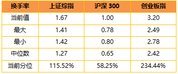 本周A股交投活跃度有所回升。A股日均成交额上升至2.14万亿的水平(前值1.89万亿)。上证指数、沪深300和创业板指换手率均有所上升。其中沪深300换手率01.00%,上证综指换手率1.67%,创业板指换手率3.20%。