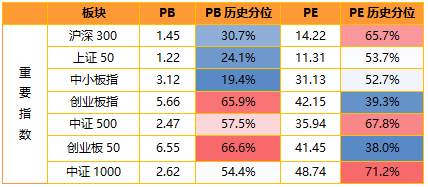 本周大盘权重指数估值水平整体上行。具体看,创业板指估值分位数上升10.4%,中小板指估值分位数上升8.4%,创业板50估值分位数上升8.3%,中证1000估值分位数上升7.4%,沪深300估值分位数上升5.5%,中证500估值分位数上升2.7%,上证50估值分位数上升0.5%.横向比较看,沪深300、中证500和中证1000估值分位数位于65%-75%附近的高历史分位区间,创业板50和创业板指位于35%-40%附近的低历史分位区间。