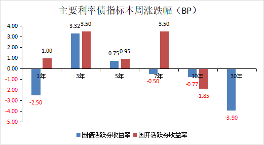 本周债券中短端表现较差,曲线走平,其中1年国债活跃券下行2.49BP至1.21%,10年国债活跃券下行0.17BP至1.81%附近,30年下行幅度更大。本周资金面持续偏松,资金价格维持低位,截至周五隔夜R001加权收至1.29%,R007加权收至1.40%。